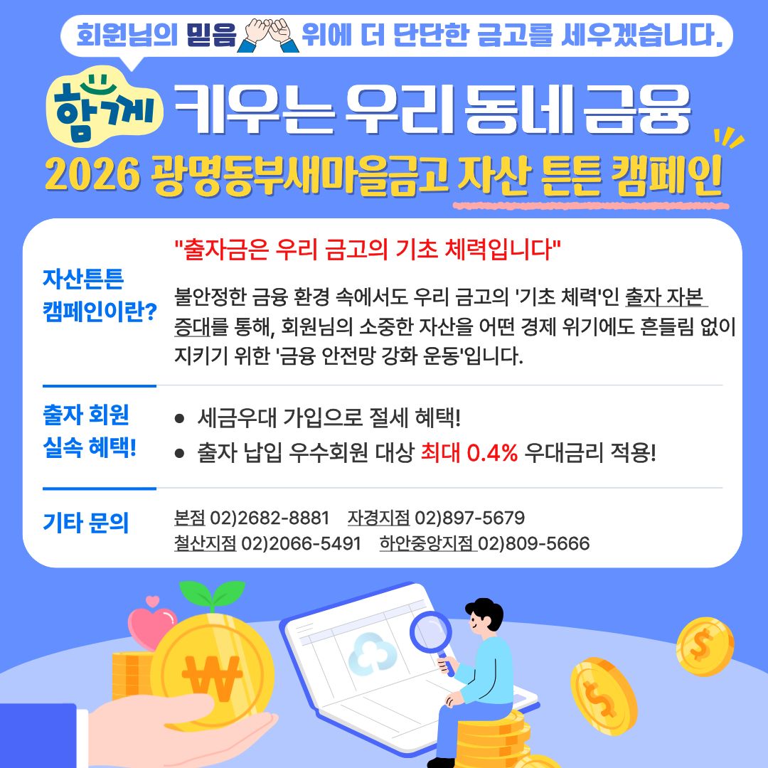 광명동부새마을금고(이사장 한상구)에서는 지난 2026년 1월 20일(화) 광명시니어클럽(관장 김은숙)과 본점 2층 중회의실에서 ‘시니어금융 업무지원사업’ 추진을 위한 업무협약을 체결했다.