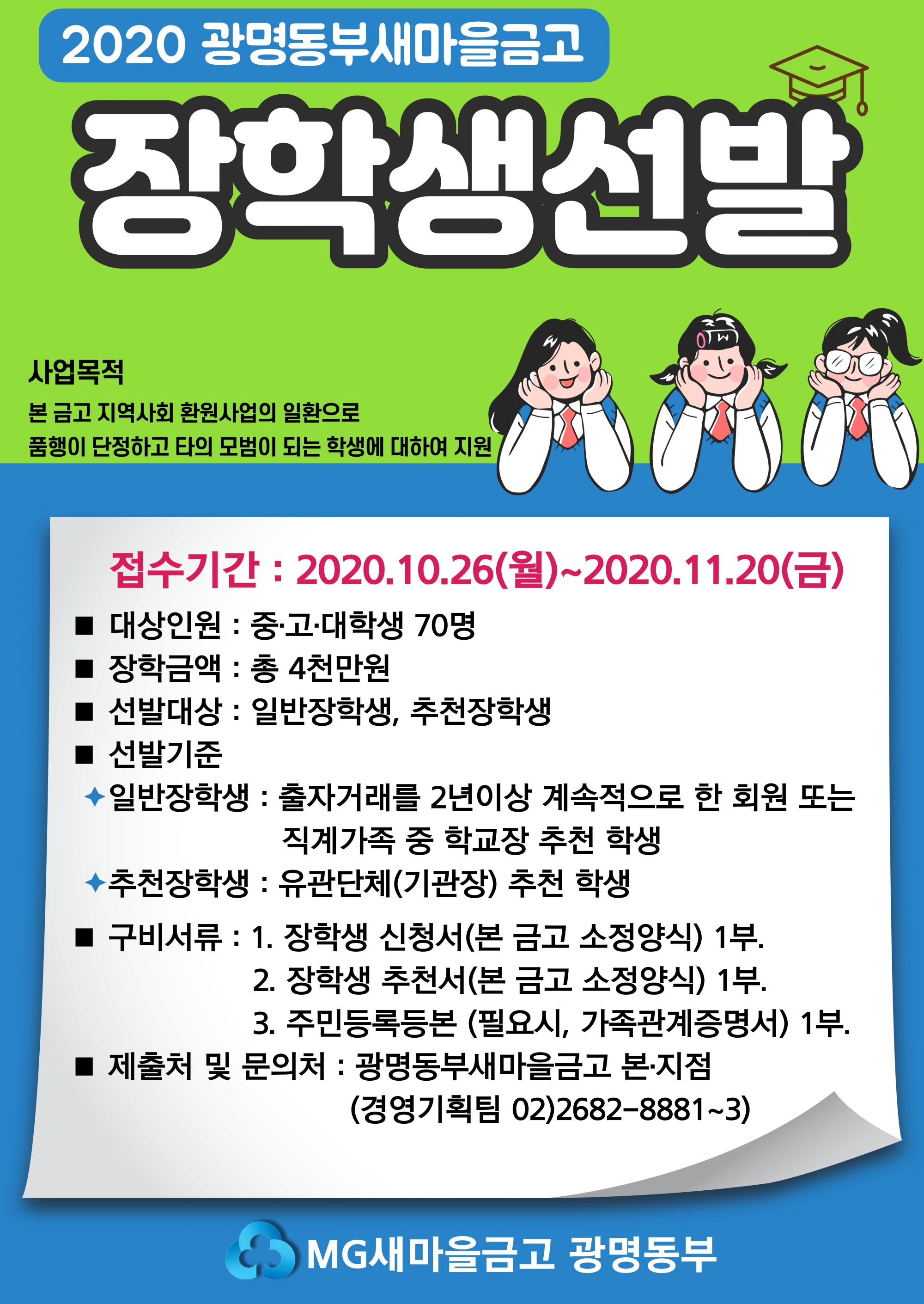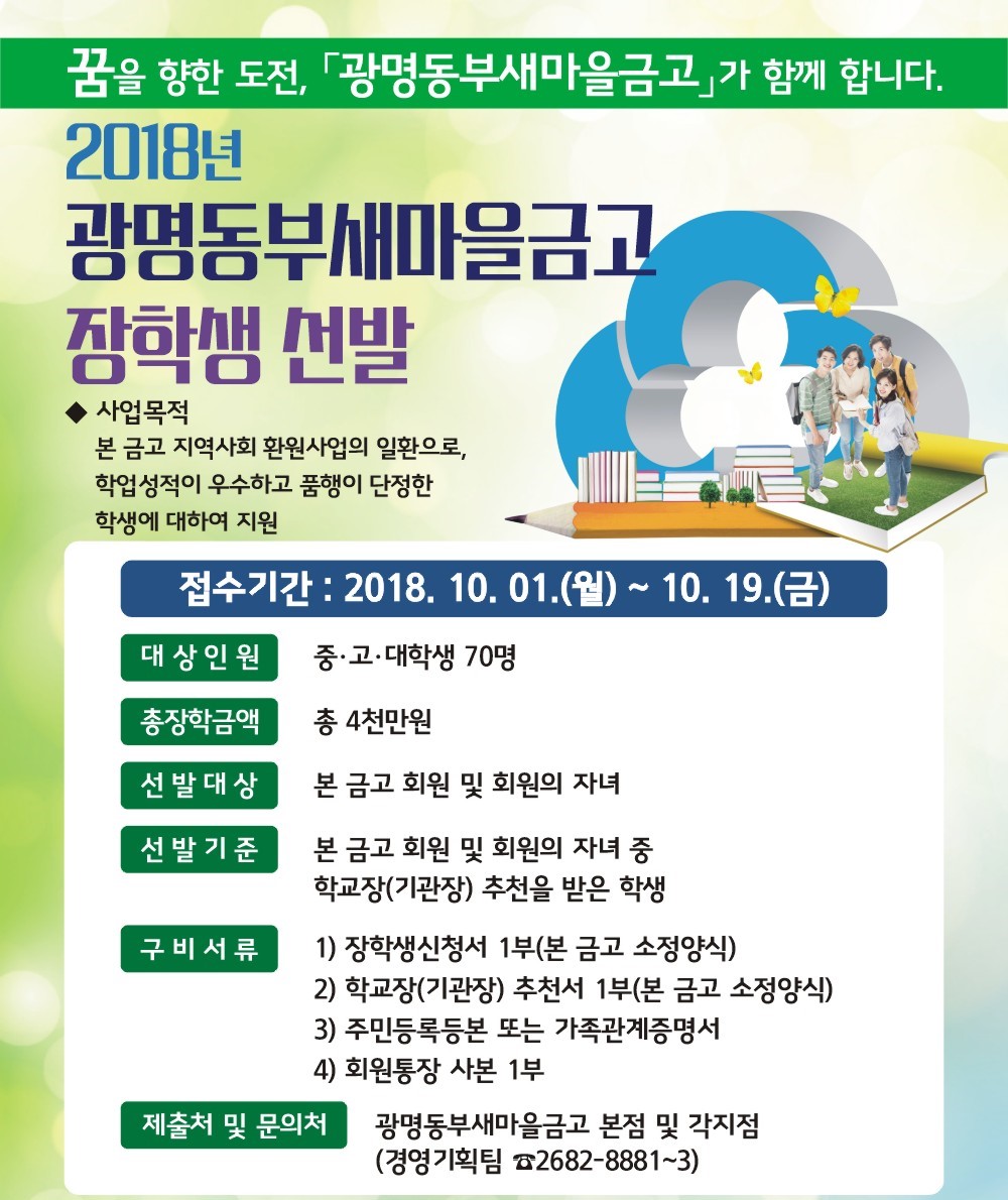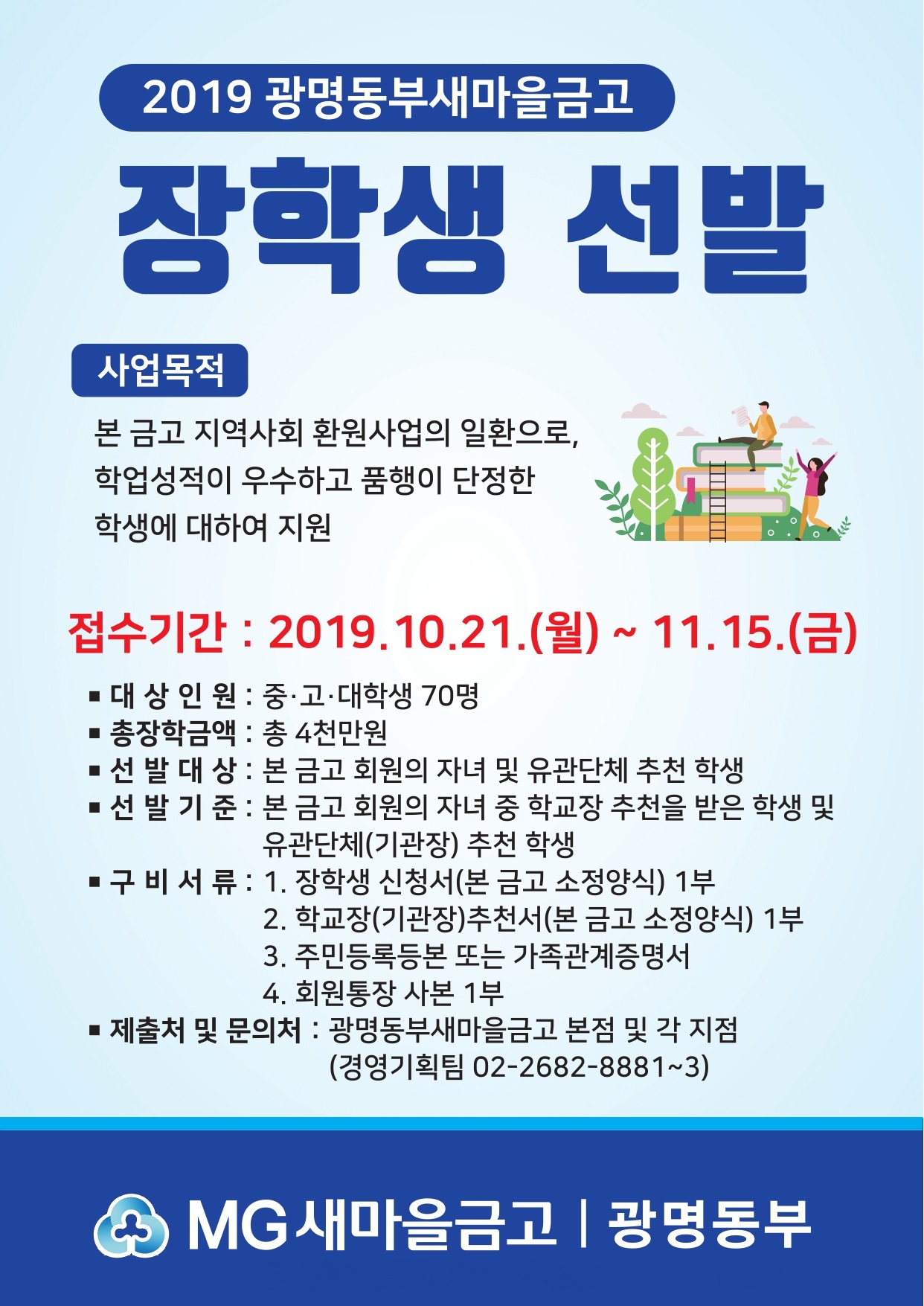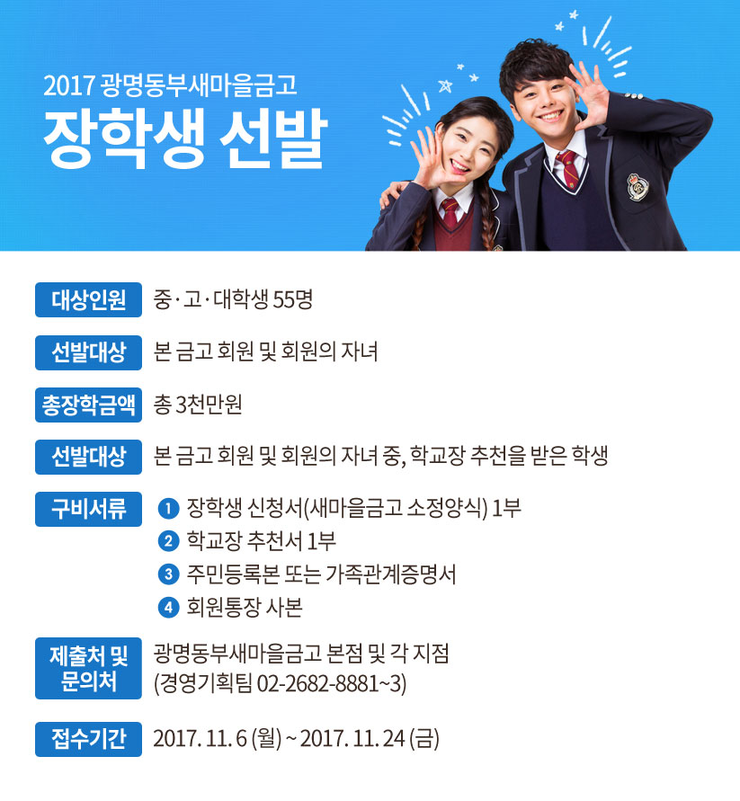 본 금고에서는 우리 이웃의 자녀들에게 학자금을 지원하여 국가와 지역사회를 이끌 어 갈 우수인재 양성에 기여하고 있습니다.